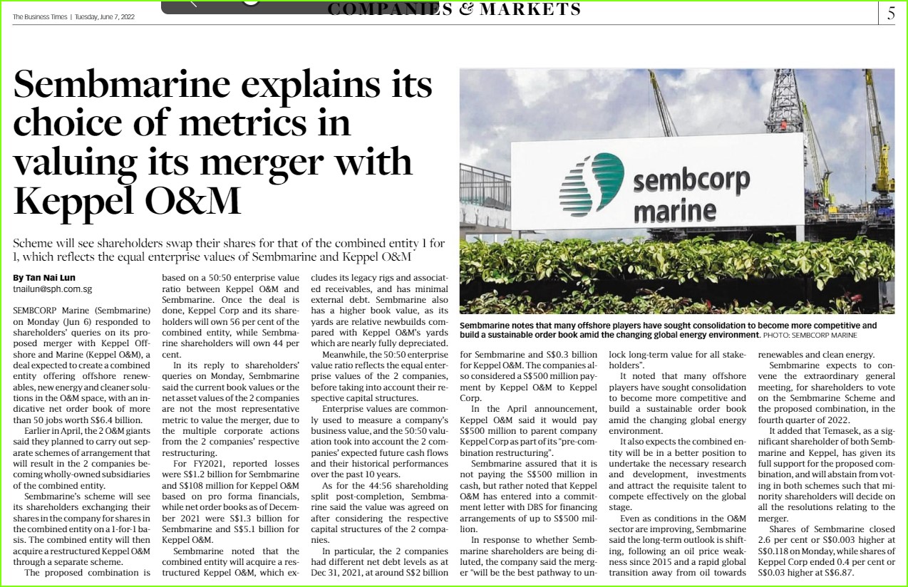(1) .. a deal expected to create a combined entity offering offshore renewables, new energy and cleaner solutions in the O&M space, with an indicative net order book of more than 50 jobs worth S$6.4 billion.