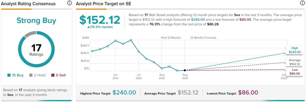 The sentiment surrounding Sea on Wall Street is overwhelmingly bullish right now. The global consumer internet company has a Strong Buy consensus rating based on 15 Buys and two Holds. The average Sea Limited price target of $152.12 implies upside potential of 76.3%.