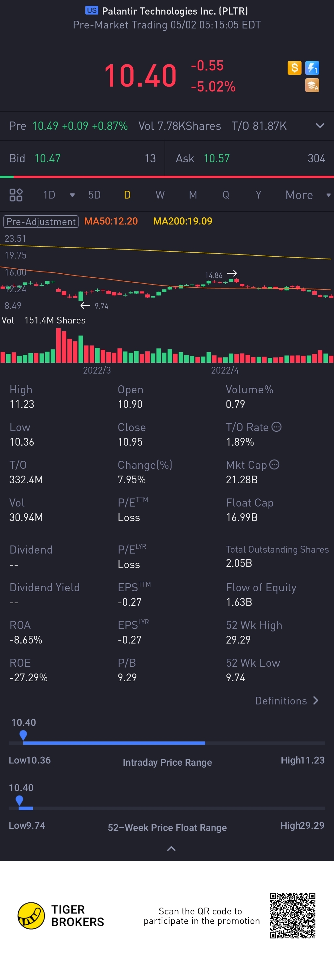 $Palantir Technologies Inc.(PLTR)$Results to be announced on 9 May. Share price is already at $10.96. Can't imagine the share price if earnings fail to meet estimates.