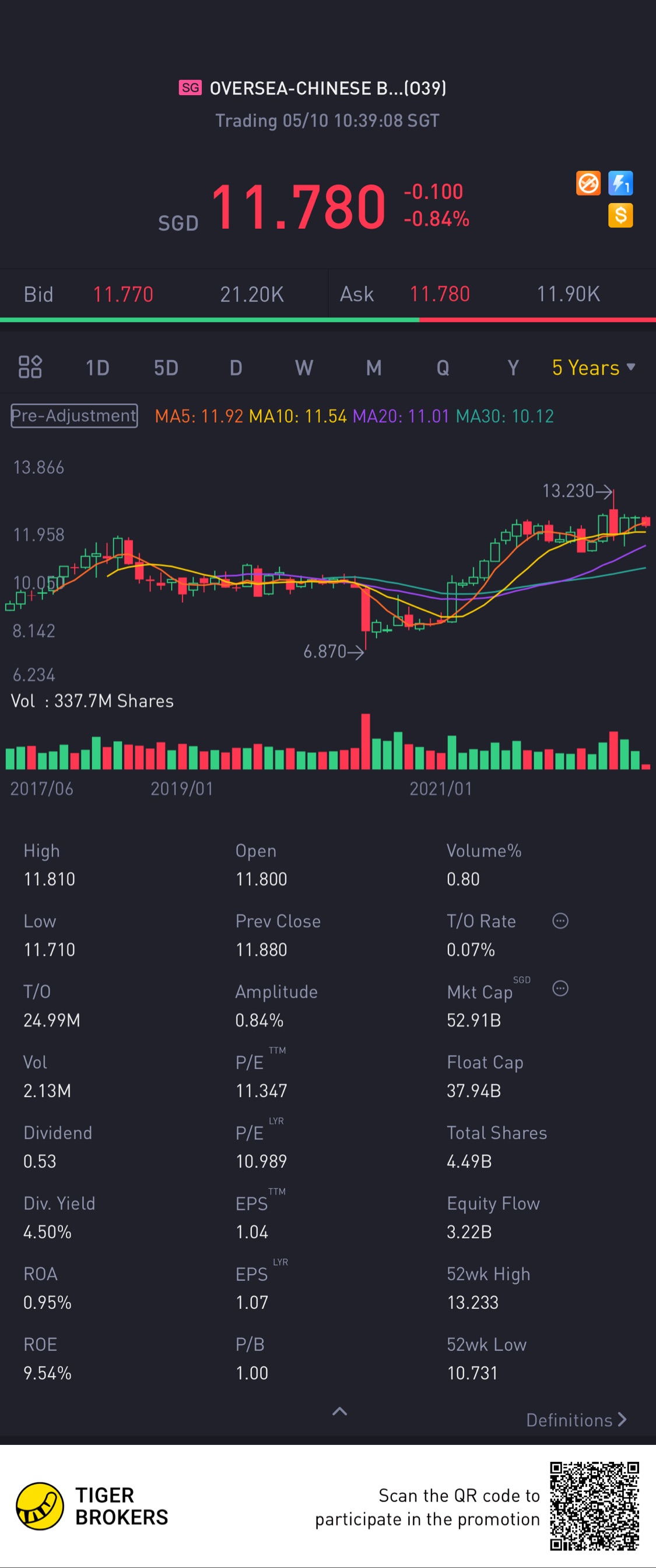 $OVERSEA-CHINESE BANKING CORP(O39.SI)$Considering to seize the opportunity to buy more in red!