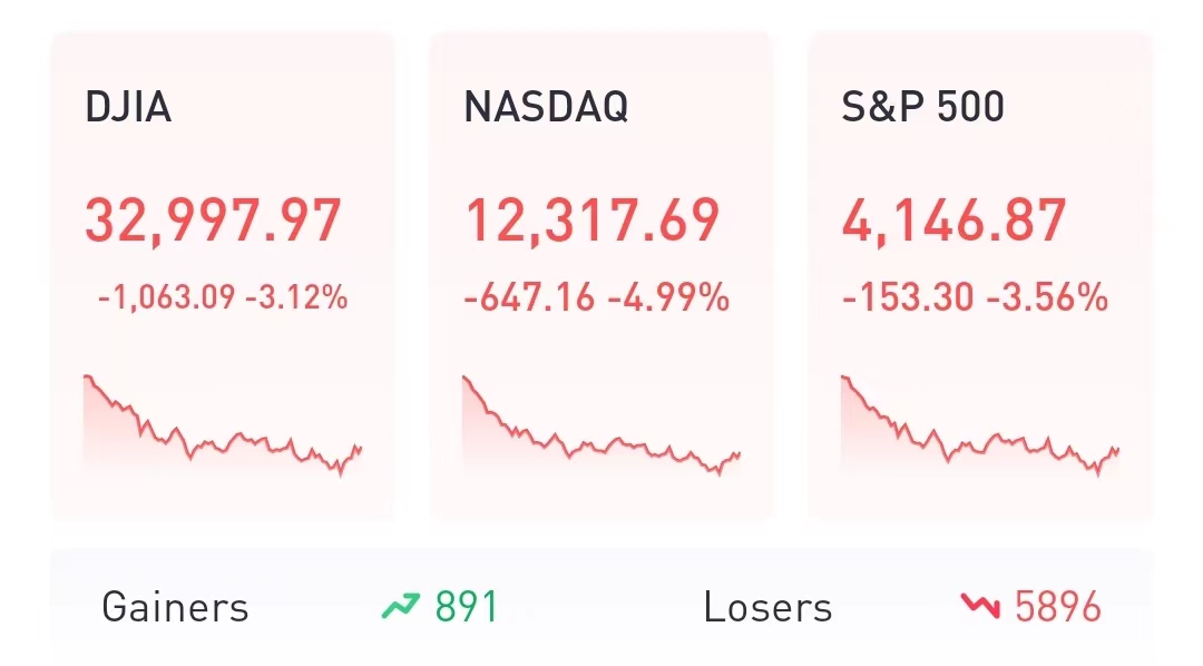 Up big one day, down hard the next. Stocks tumbled Thursday, giving back all the post-FOMC gains, plus more... The $DJIA(.DJI)$ retreated 1,063 points, or 3.1%. The $S&P 500(.SPX)$ dropped 3.6%, and $NASDAQ(.IXIC)$ declined 5%. The last time the Nasdaq declined more than 5% was June 11, 2020...
