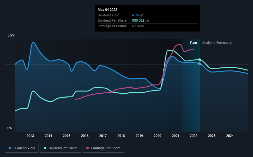 The company's upcoming dividend is S$0.031 a share, following on from the last 12 months, when the company distributed a total of S$0.062 per share to shareholders. Based on the last year's worth of payments, Sheng Siong Group stock has a trailing yield of around 4.0% on the current share price of SGD1.54. If you buy this business for its dividend, you should have an idea of whether Sheng Siong Group's dividend is reliable and sustainable. So we need to check whether the dividend payments are covered, and if earnings are growing.