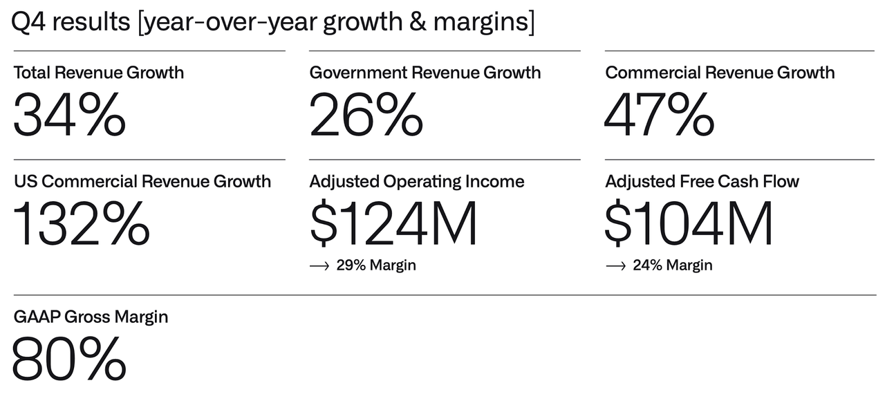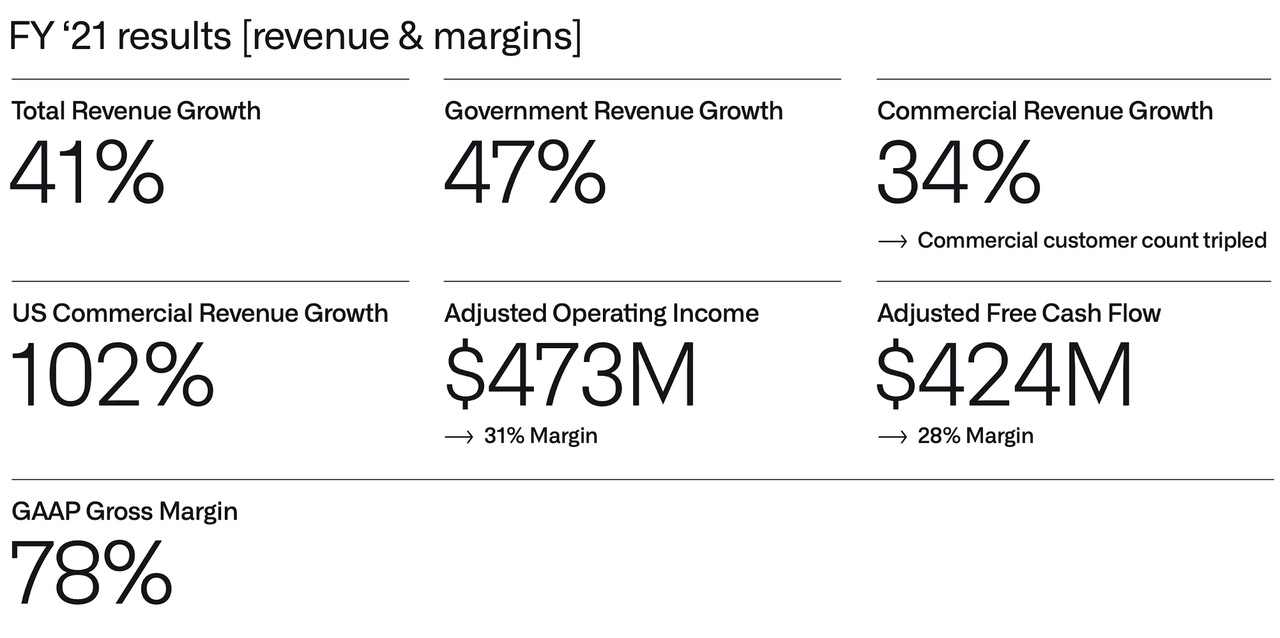 The company's full-year results were also awe-inspiring. We saw total revenue growth increase by a whopping 41% YoY. U.S. commercial revenues expanded by more than 100% YoY. GAAP gross margin came in at 78%, and the company's adjusted operating margin was 31%, or $473 million last year. We see that Palantir has remarkable growth momentum coupled with enormous earnings potential, a dynamic that should enable the company to become highly profitable over the next several years. Furthermore, the company expects to see 30% revenue growth or higher through 2025.