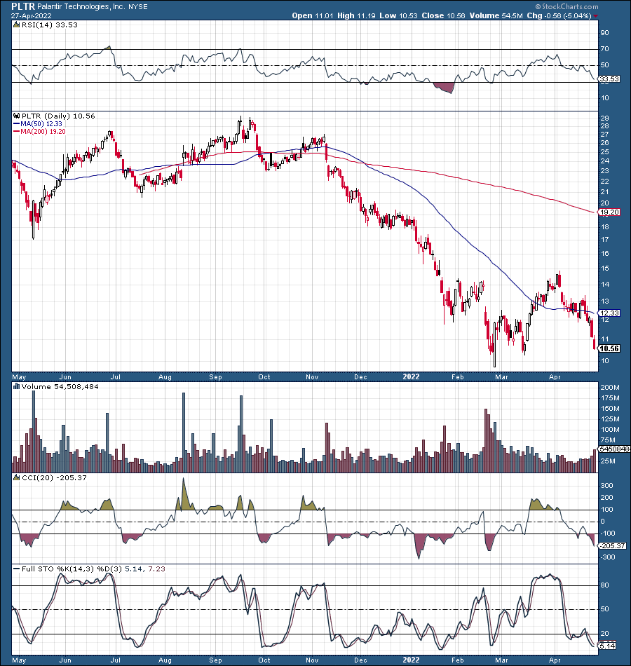 We see Palantir's epic fall from its September 52-week high top of nearly $30 to below $10 in February. After a month-long recovery, the stock is back down near the $10 range. The renewed Fed-induced growth scare has contributed to the recent wave of selling, bringing Palantir's stock back down into technically oversold territory. Palantir's RSI is close to 30 again, illustrating oversold technical dynamics. Moreover, the full stochastic is down to 5, a level often associated with a momentum shift, implying a change towards a more positive momentum is approaching.