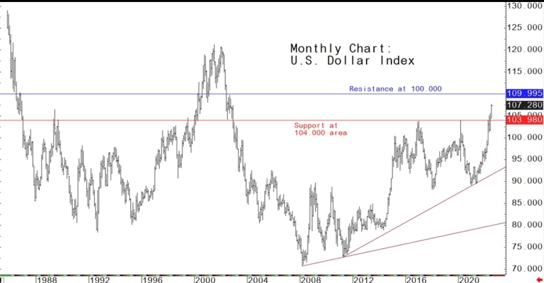 (Kitco News) - The U.S. dollar index is a basket of six major global currencies weighted against the greenback. The USDX this week hit a 20-year high, supported by rising U.S. interest rates and safe-haven demand for the greenback and for U.S. Treasuries that are purchased in U.S. dollars. It’s not just that the U.S. economy is stronger or that U.S. interest rates are out-pacing the rate rises in other major economies. Rather it’s a combination of the latter and the fact that the Euro zone is facing an energy crisis and rising inflation that have sapped its countries’ economies and in turn put keen downside price pressure on the Euro currency against the U.S. dollar.