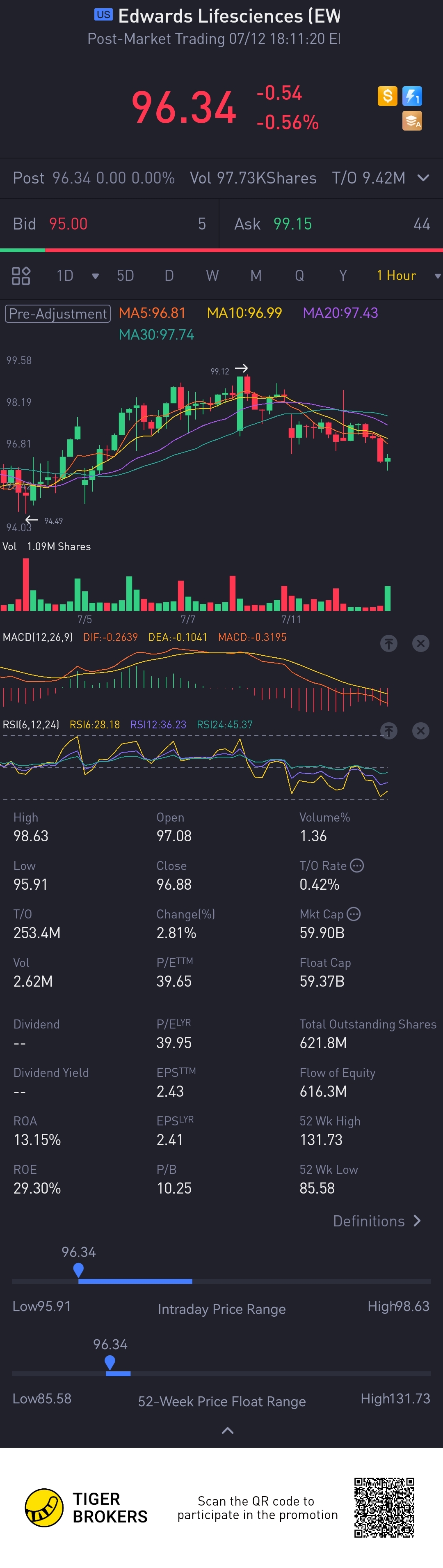 $Edwards Lifesciences(EW)$Edwards Lifesciences Corporation is a manufacturer of heart valve systems and repair products used to replace or repair a patient's diseased or defective heart valve. The Company is engaged in patient-focused innovations for structural heart disease and critical care monitoring. Its segments include United States, Europe, Japan and Rest of World. Its products and technologies are categorized into four main areas: Transcatheter Aortic Valve Replacement, Transcatheter Mitral and Tricuspid Therapies, Surgical Structural Heart and Critical Care. It also develops hemodynamic and noninvasive brain and tissue oxygenation monitoring systems that are used to measure a patient's cardiovascular function in the hospital setting. The Edwards SAPIEN family of valves, including Edwards SAPIEN XT, the Edwards SAPIEN 3, and the Edwards SAPIEN 3 Ultra transcatheter aortic heart valves are used to treat heart valve disease.