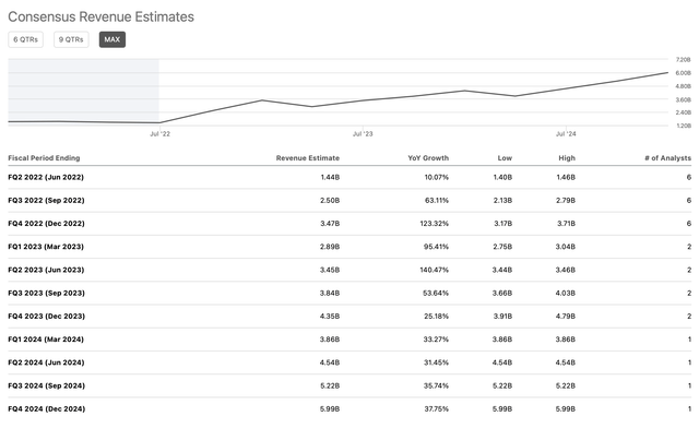 We see that NIO's revenues should increase substantially in the coming years. Additionally, NIO's price-to-sales ratio is quite depressed right now. Many companies with much less growth trade at P/S multiples much higher than 2.75, or 5. For instance, Tesla (TSLA) trades at about seven times forward sales, and Lucid (LCID) trades at approximately ten times forward sales estimates.