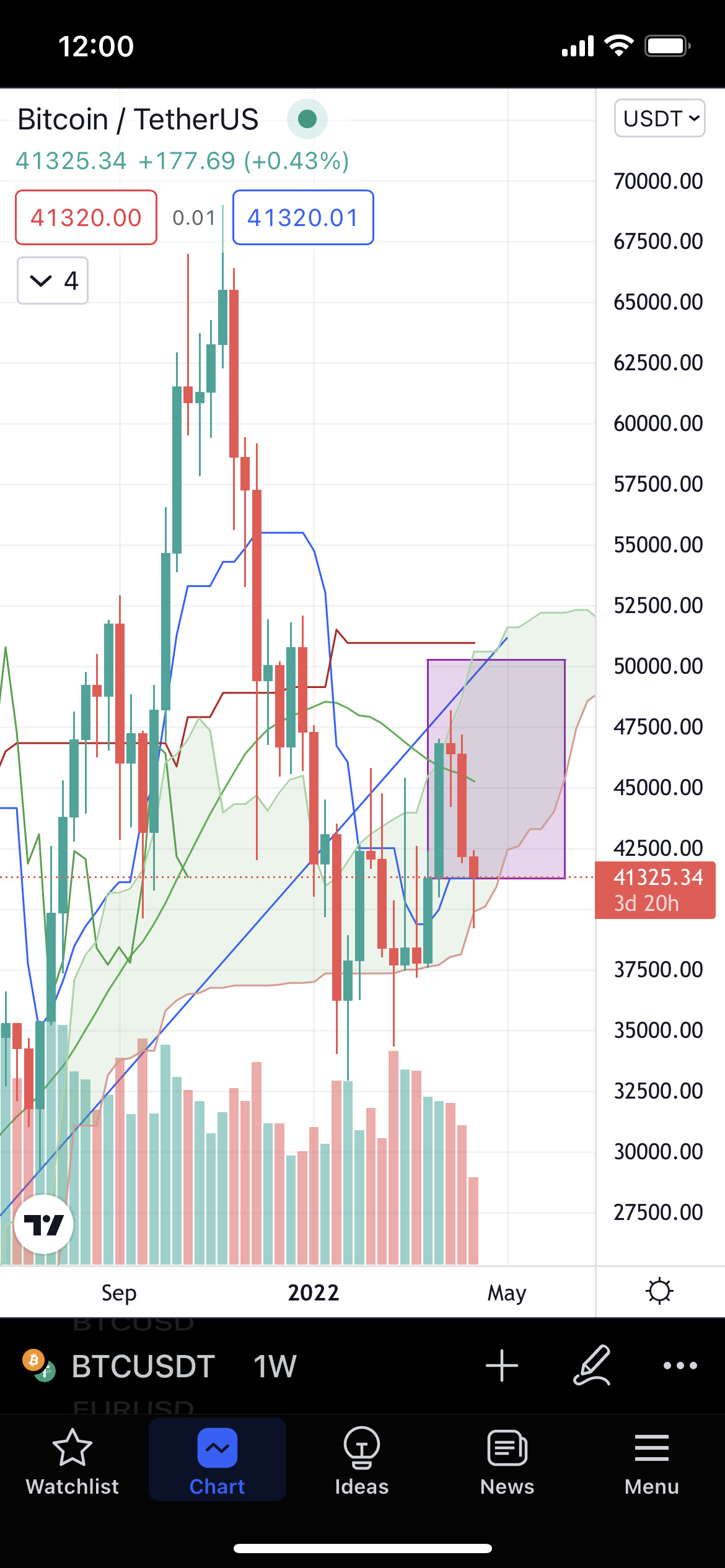 Bitcoin seems to have rebounded from the bottom of cloud to tenkan (blue support line) And forms a hammer. This is a bullish sign. Tonight and next week, once a confirmation reversal is in, it is likely to go up to $50k. Cross fingers