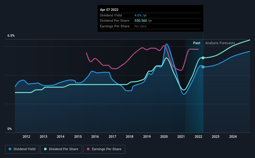 While the company has been paying a dividend for a long time, it has cut the dividend at least once in the last 10 years. The dividend has gone from S$0.30 in 2012 to the most recent annual payment of S$0.56. This means that it has been growing its distributions at 6.4% per annum over that time. A reasonable rate of dividend growth is good to see, but we're wary that the dividend history is not as solid as we'd like, having been cut at least once.
