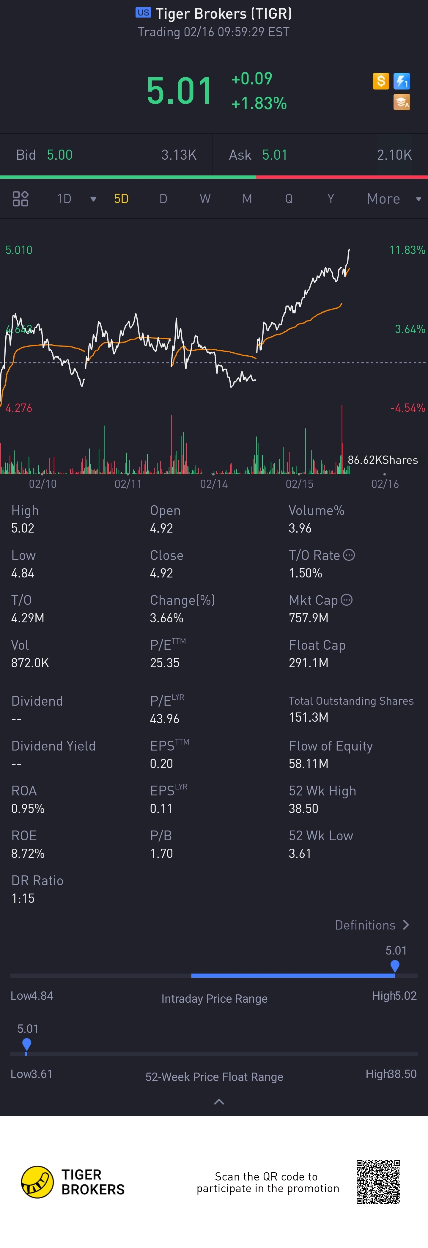 $Tiger Brokers(TIGR)$wah...finally hit $5.. hope it will be upward trend