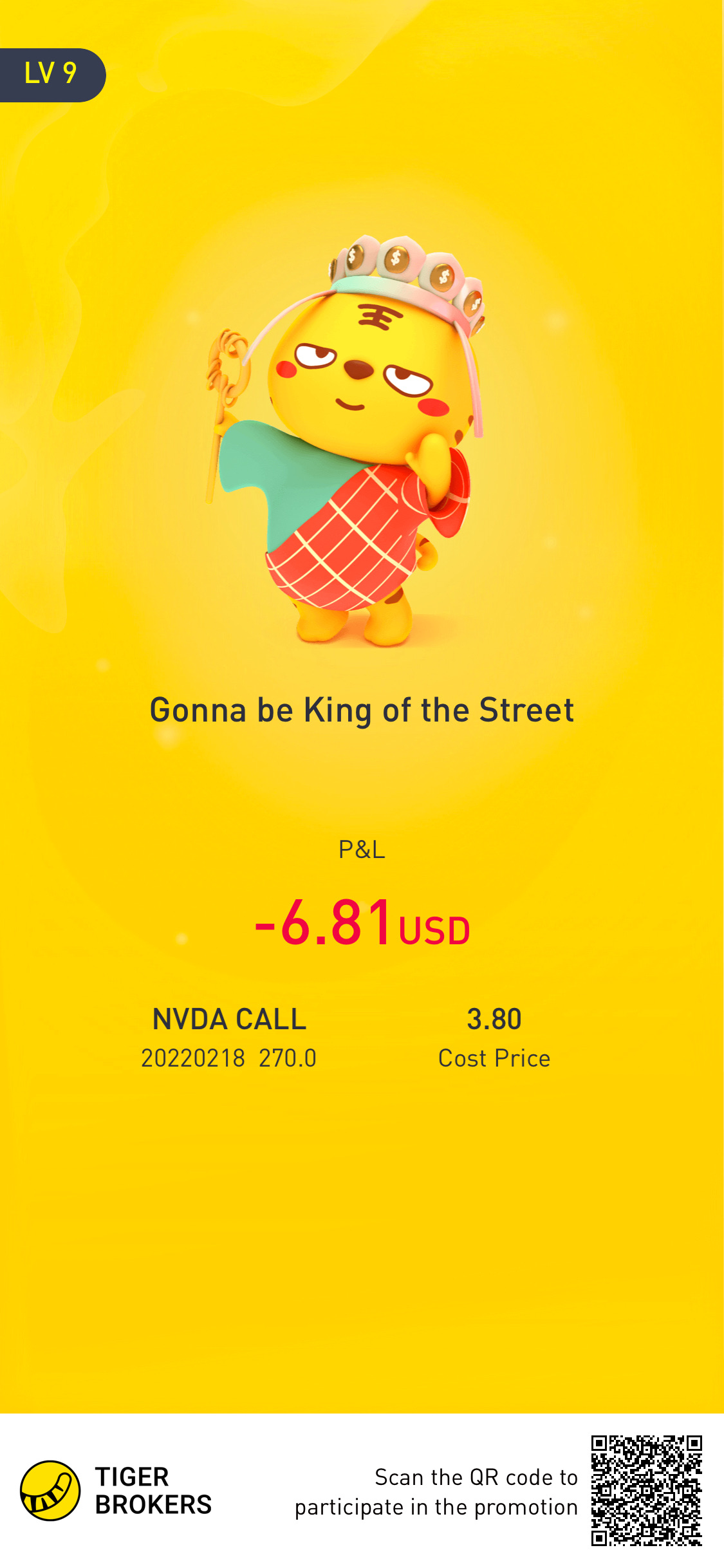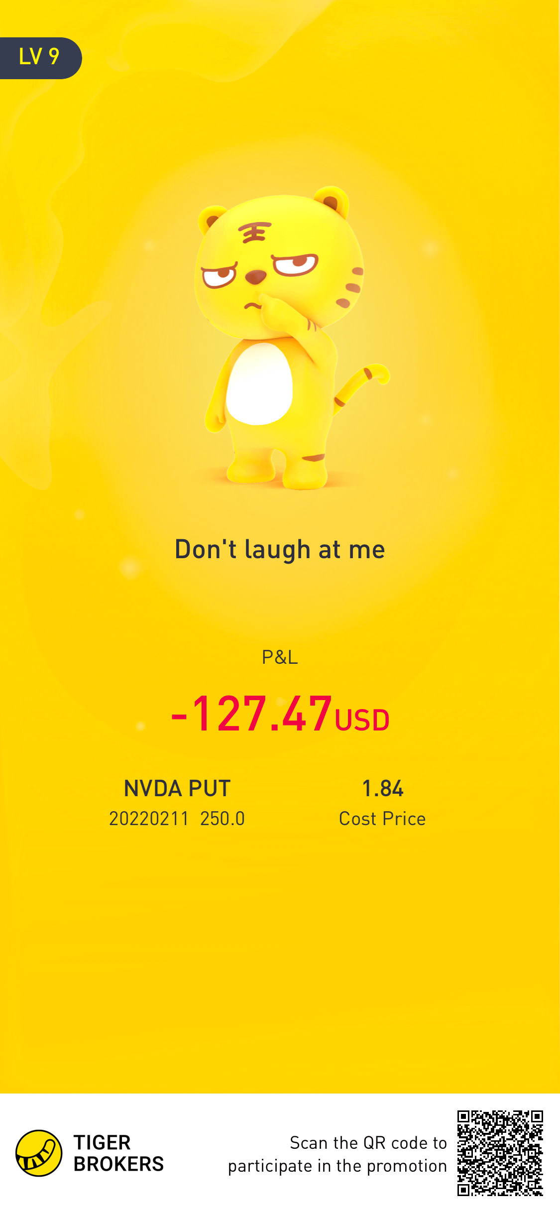 @Louisyeolet me feed a troll. That was 10 lots on NVDA put on 250 strike price. Take aguess where it would be if I sold when it gotto 240 near closing, I don't know cos I didn't[Happy] [Happy]