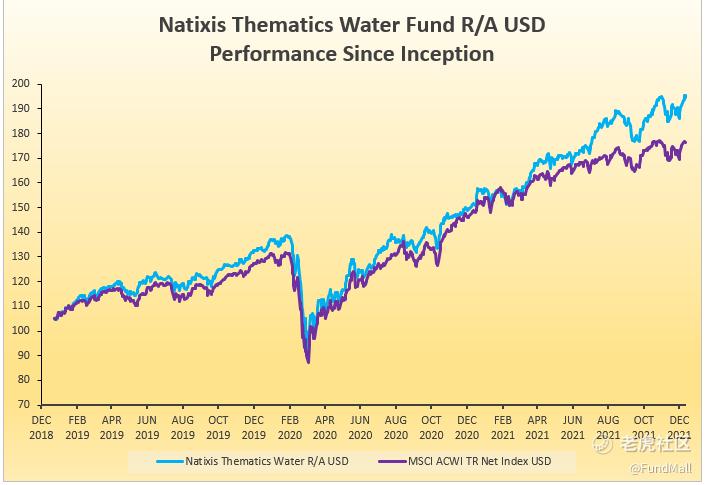 $Natixis Thematics Water R/A USD fundis actively managed, it applies a fundamental and bottom-up stock selection process which invests in companies that are involved in water demand management, pollution control, water infrastructure services and water utilities. It identifies companies with an attractive risk-return profile that are driven by secular trends as well as meeting ESG requirements. The reference benchmark is MSCI All Country World Index (ACWI) Net Total Return Index which captures large and mid-cap stocks across 23 developed markets and 25 emerging markets countries (Source: MSCI).