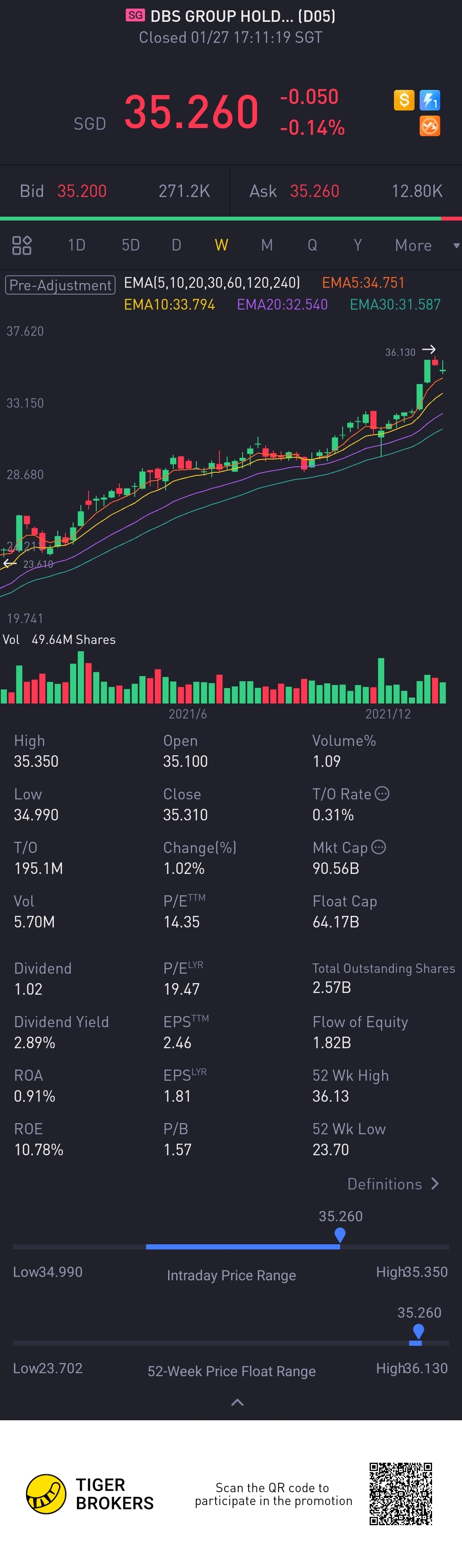 $DBS GROUP HOLDINGS LTD(D05.SI)$ DBS with all time high. [Miser] [Miser]
