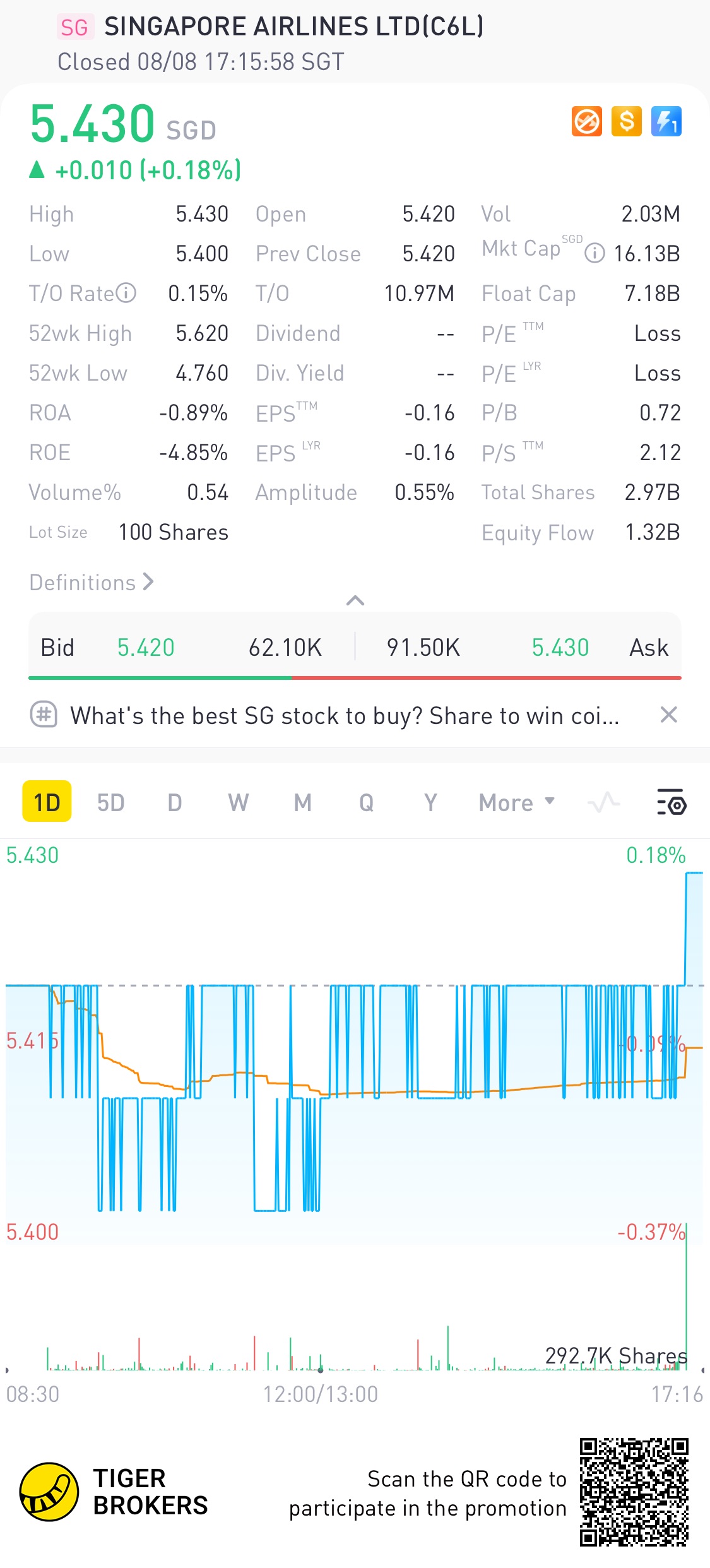 $SINGAPORE AIRLINES LTD(C6L.SI)$up