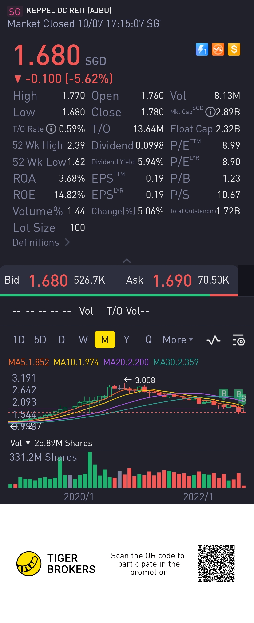 $KEPPEL DC REIT(AJBU.SI)$potential to go up. Now is a good time to accumulate and doing price averaging for those who bought above $2.00