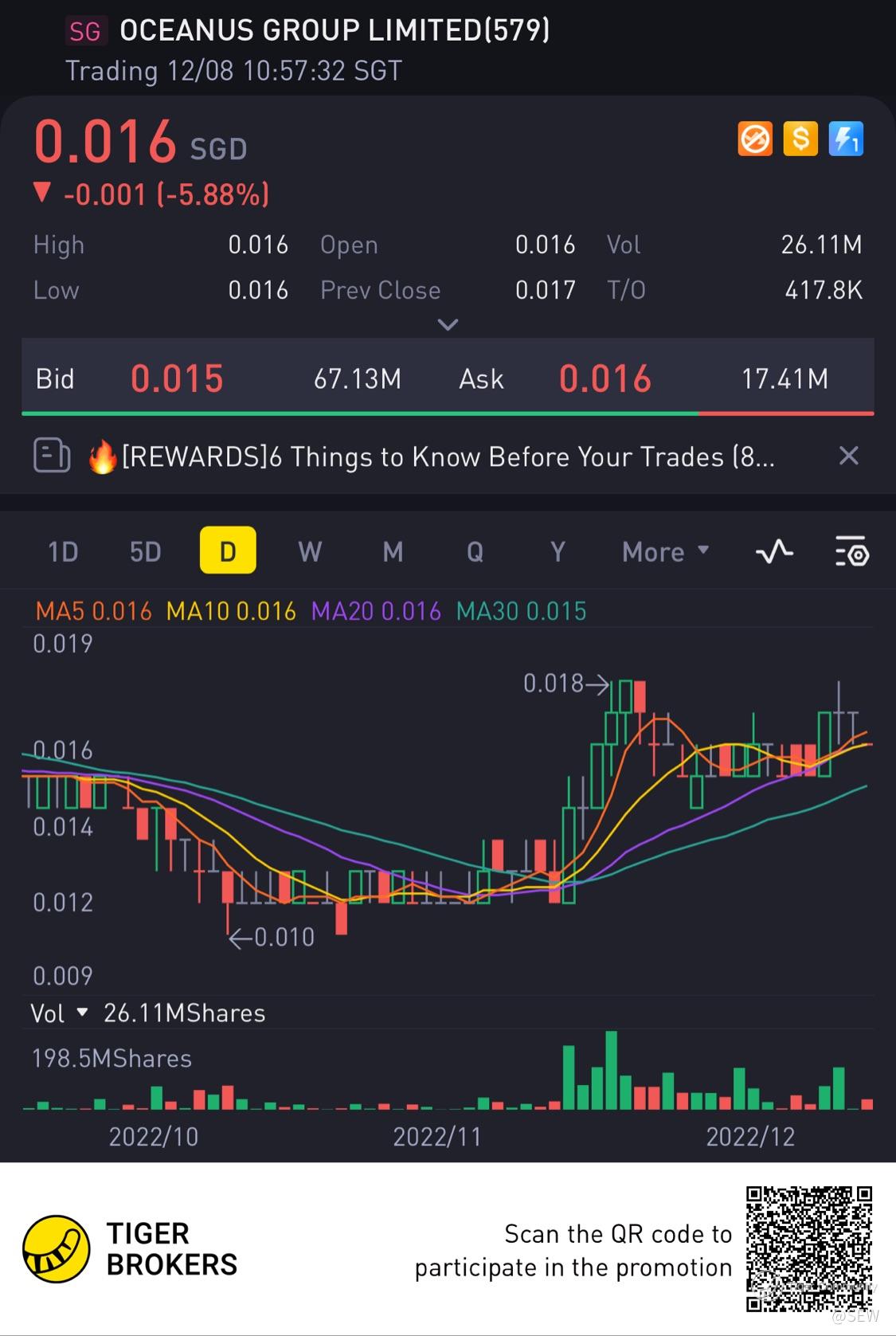 $OCEANUS GROUP LIMITED(579.SI)$ Really slow and steady. I sold half at 17 (Those I added at 15) Bought back some at 16.