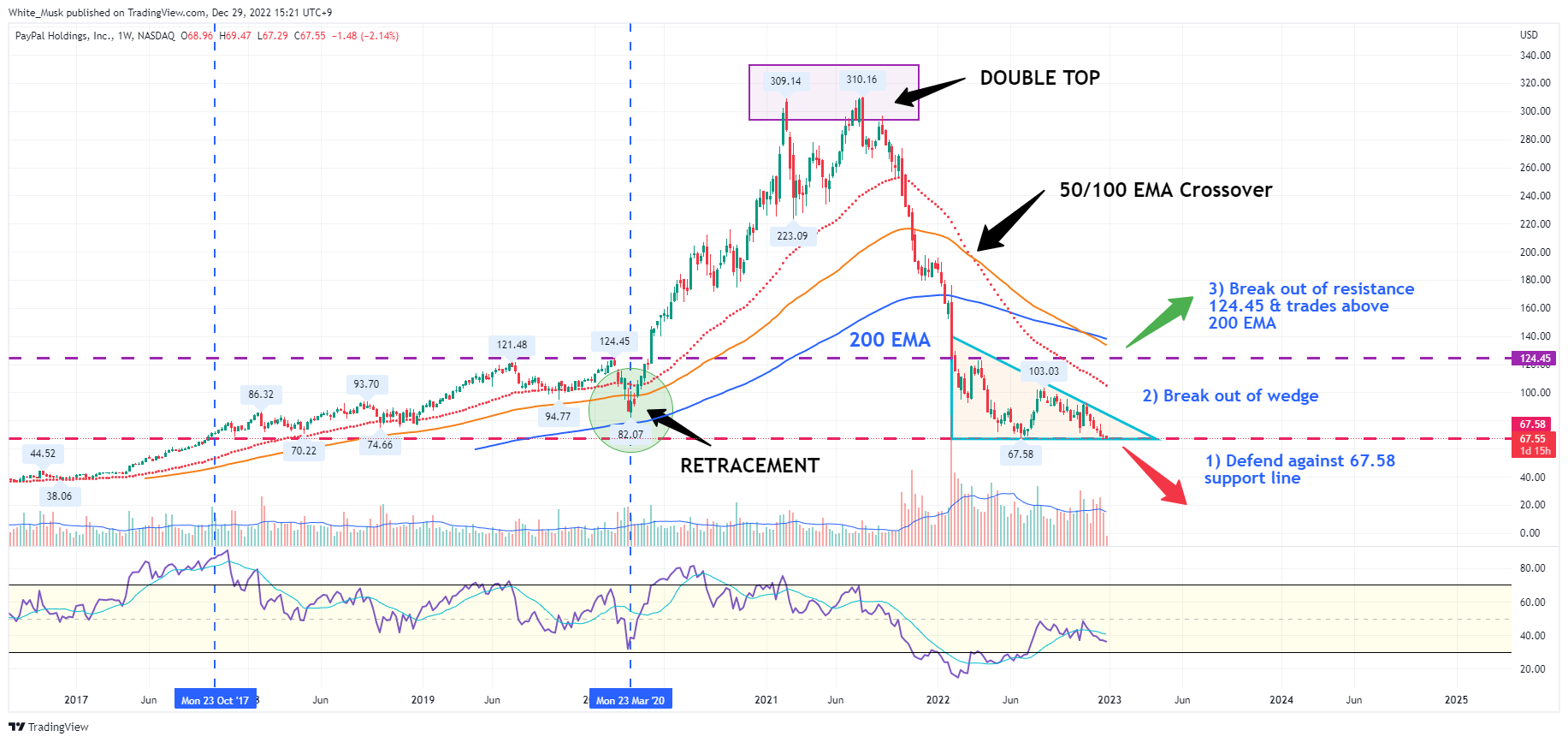 For me, I will be looking at whether the bulls can defend their support line at $67.58. If they do, can price break out of the wedge consolidation? Lastly, can they break the bear resistance level at $124.45 and reclaim 200 days EMA? I am not worried about missing out on the chance to buy the stock at it's lowest level. (Because I am not a fortune teller and I won't be able to know where is the lowest.) I am more concerned about trading with the trend. If the bulls take charge, then I want to follow them & ride the trend higher, not trying to go against the odds and be the hero to charge first.