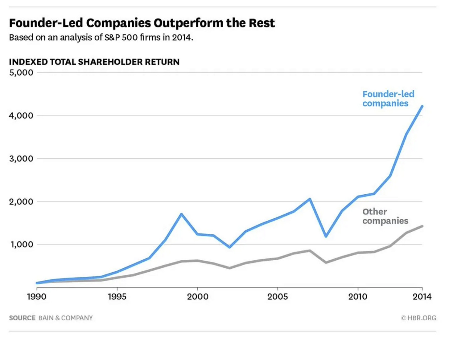 Founder-led companies have historically outperformed the rest. Makes sense (incentives, vision/mission, culture, growth stage, etc).