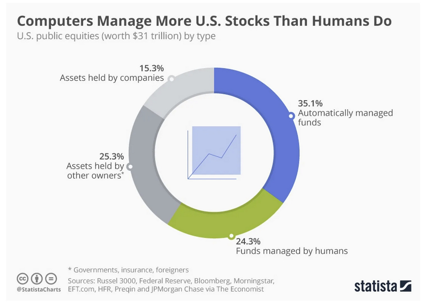 Apparently computers got more AUM than humans... (maybe a debate to be had around semantics on this e.g. automatic rebalancing is designed by humans, even passive investing is essentially following the decisions of the humans at the index providers, and algo/quant traders are still the product of armies of PhD bearing humans). Intriguing development anyway, with most likely intriguing impact on market structure/function.