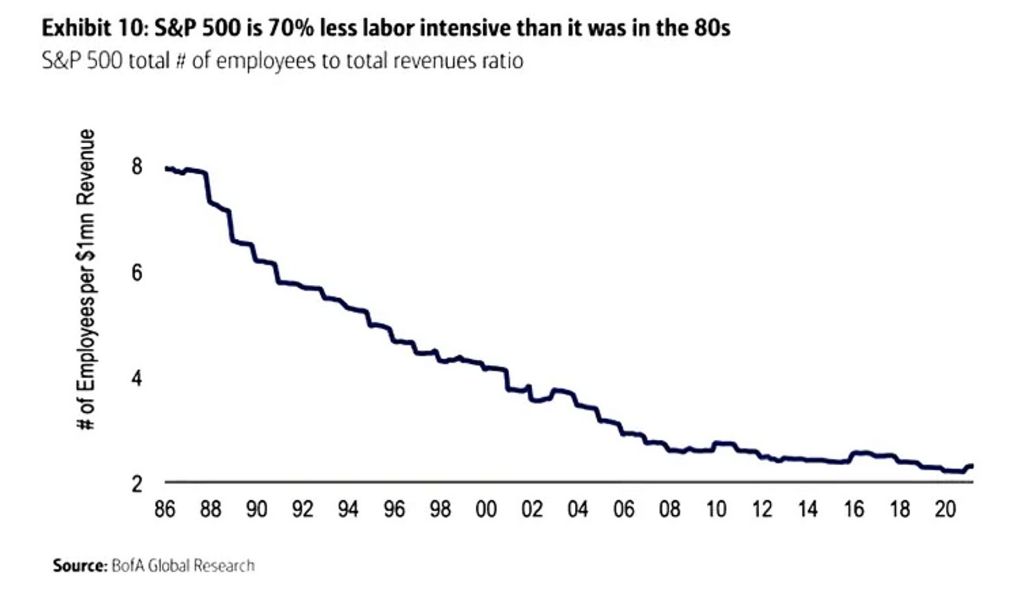 "In 1986, it took 8 employees to generate US$1 million in revenue. Today, the S&P 500 is 70% less labor intensive than it was in the 80s"