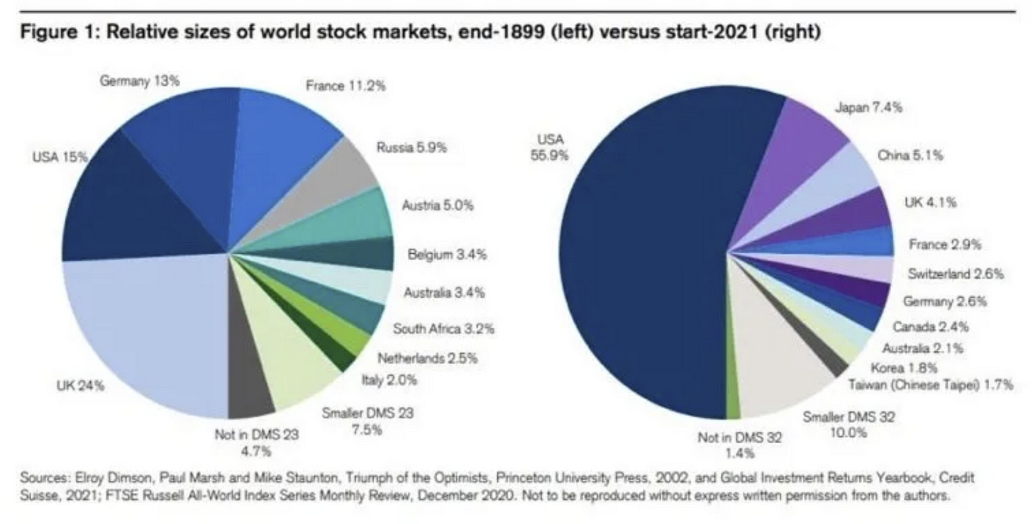 The US stock market went from 15% of global equity markets in 1899 to 56% in 2021. Makes you wonder, what will the next 122 years bring?