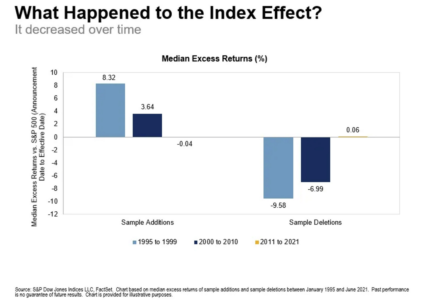 Used to be that when a stock got added/deleted from an index you'd see a big bump/dump, no more. Perfect example of a market anomaly getting arbitraged out of existence.