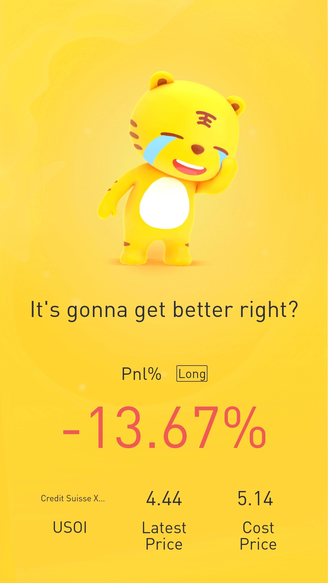 $Credit Suisse X-Links Crude Oil Shares Covered Call ETNs(USOI)$with the monthly dividends.. I will be breaking even soon... Winter coming so demand for oil will be high for the west...