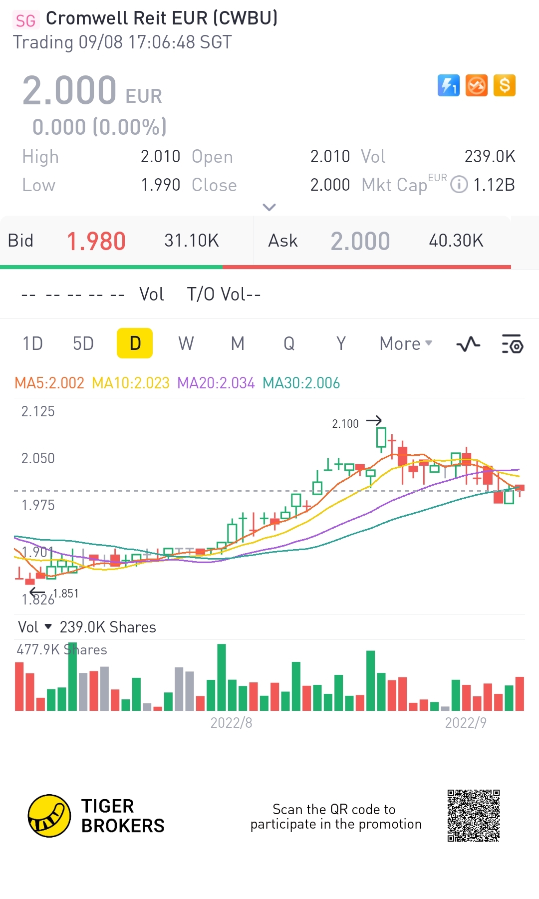 $Cromwell Reit EUR(CWBU.SI)$$Straits Times Index(STI.SI)$Everyone is talking about SGX REIT, I would like to share this with EUR currency. Since EUR in it's historical low, why not invest in this REIT, collect dividend yield 8+% whilewait for EUR to go up. Win-win [serious]. What do you think [Doubt]