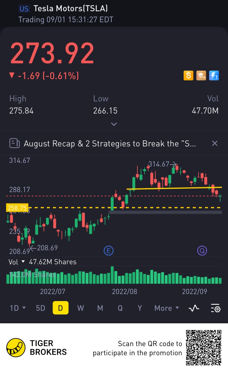 $Tesla Motors(TSLA)$ currently forming a Head & Shoulder shape. Short tp would be looking at the next resistance level at$258+- [Observation] [Put]