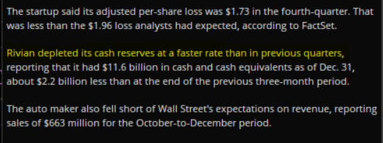 $Rivian Automotive, Inc.(RIVN)$ Rivian running out of cash sooner than planned. There's not enough time for this company to produce enough profits to offset the need for capital raise - 1) issue debt 2) dilute shareholders. last choice - file bankruptcy and start over with new shareholders.$NIO Inc.(NIO)$ $Tesla Motors(TSLA)$ $SPDR S&P 500 ETF Trust(SPY)$