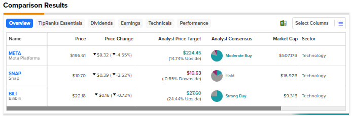 Social media stocks have been in focus of late as they are expected to benefit from the potential ban on TikTok by the Biden Administration. Rising competition from TikTok, Apple’s ( $Apple(AAPL)$ ) iOS privacy update, and the impact of macro pressures on ad spending had a major impact on social media companies last year. Using TipRanks’s Stock Comparison Tool, we placed Meta Platforms ( $Meta Platforms, Inc.(META)$ ), SNAP ( $Snap Inc(SNAP)$ , and Bilibili ( $Bilibili Inc.(BILI)$ ) against each other to pick the stock that scores Wall Street’s Strong Buy consensus rating despite near-term pressures.
