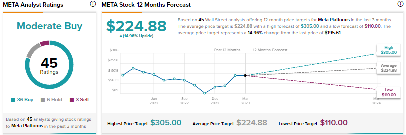 Overall, Wall Street’s Moderate Buy consensus rating is based on 36 Buys, six Holds, and three Sells. The average META stock price target of $224.88 suggests nearly 15% upside. Shares have jumped over 63% so far in 2023.
