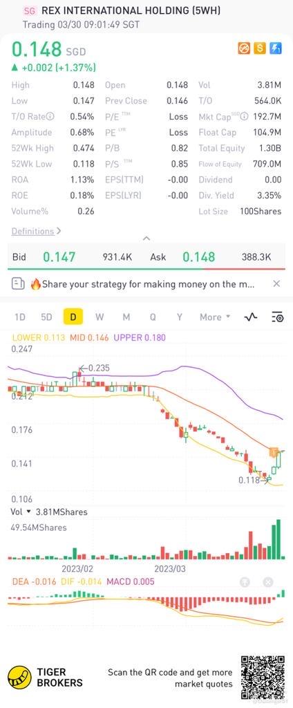 short term pain, long term gain. Big Boys trying to catch more monkey.. Watch how they cane the retail investors. $REX INTERNATIONAL HOLDING LTD(5WH.SI)$ hit mid bollinger and bounce further down.