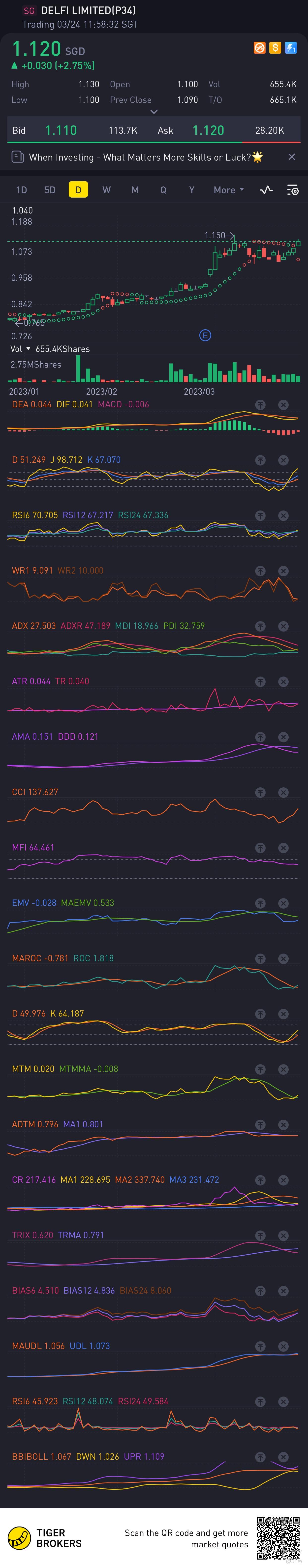 $DELFI LIMITED(P34.SI)$ Broke out of $1.11 with ease today. Looked like resistance turned support. Accumulating at $1.12 today, MaCD turning up soon, in my opinion, should move next week. Good time to add on breakout. SL for me $1.08. Jia you!
