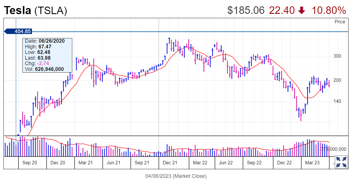 Shares tumbled back below the 200.76 buy point on April 3 following deliveries, and have kept falling below the 50-day line. TSLA stock fell more 7%-8% below the buy point, triggering an automatic sell rule for recent buyers.