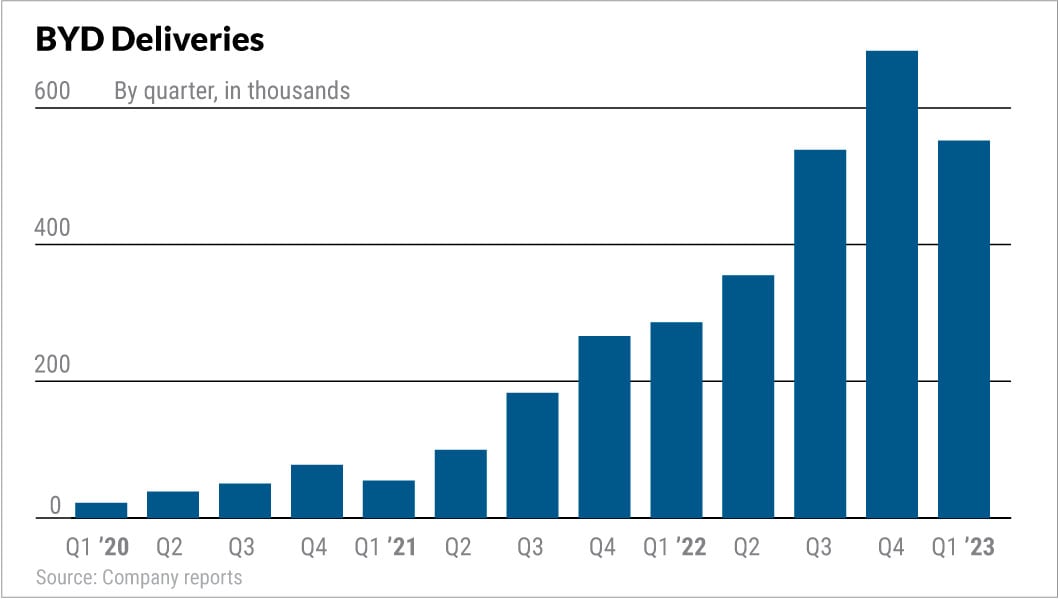 On April 2, BYD reported first-quarter sales were 552,076, up 93% vs. a year earlier but down 19% from Q4's record 683,440. Sales did pick up to 206,089 in March from February's 191,664 and January's 150,164.