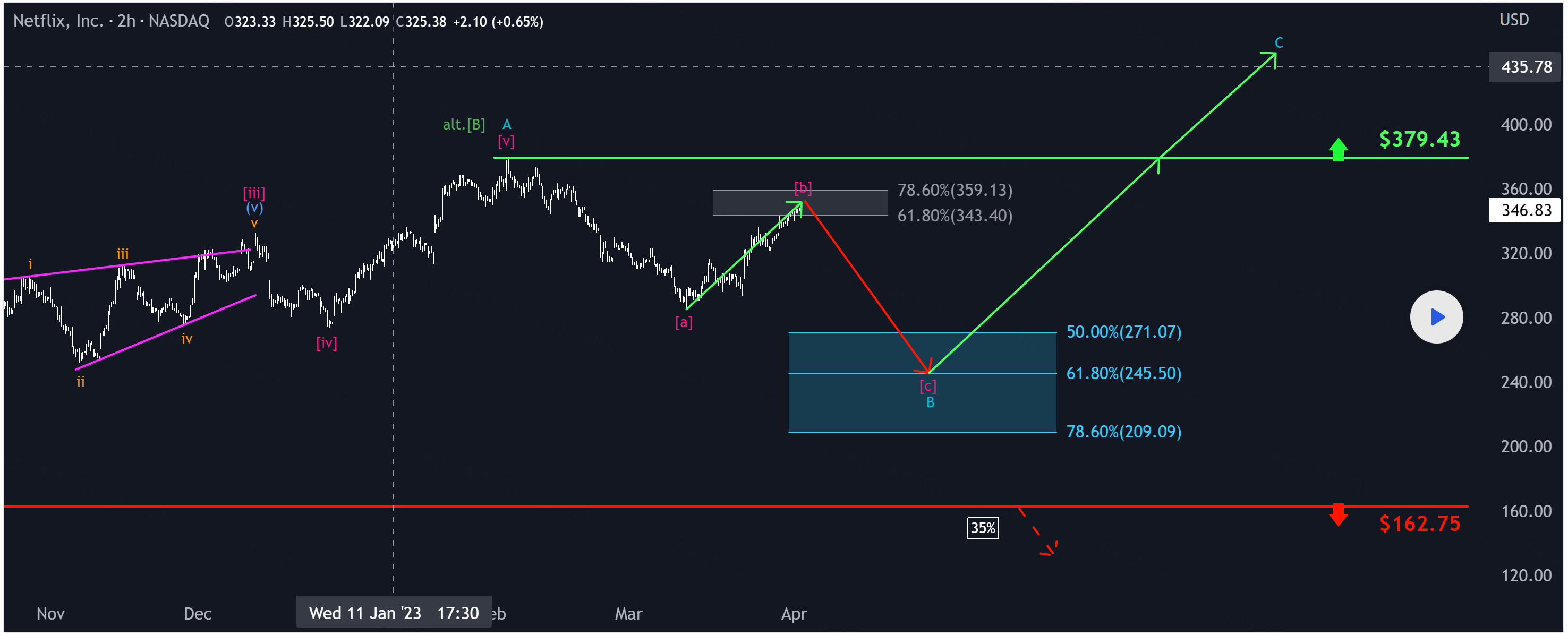 $Netflix(NFLX)$ has brought wave b in magenta on stream quite commendably and has already touched at the gray zone between $343. 40 and $359.13. Thus, wave b in magenta could be finished by now, although the share could just as well use the remaining room in the upper part of the gray zone to place the corresponding high. As soon as this is done, the course should turn and head for the turquoise zone between $271.07 and $209.09 to develop wave B in turquoise. Afterward, Netflix should tackle the resistance at $379.43, which should then be conquered by wave C in turquoise. However, we should still keep in mind the 35% chance that the stock could break through the turquoise zone and drop below the support at $162.75.