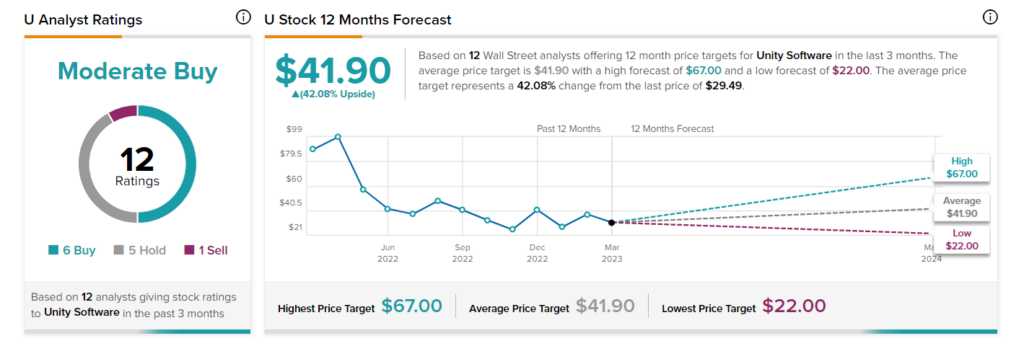 Analysts are cautiously optimistic aboutU stock. It has a Moderate Buy consensus rating based on six Buy, five Hold, and one Sell recommendations. Further, the average price target of $41.90 implies 42.1% upside potential. Shares of the company have gained 9.6% year-to-date.