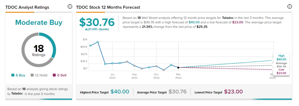 On TipRanks, Teladoc has a Moderate Buy consensus rating based on six Buys and 12 Holds. At $30.76, the average TDOC stockprice target implies 21.3% upside potential. Shares have risen over 12% year-to-date.