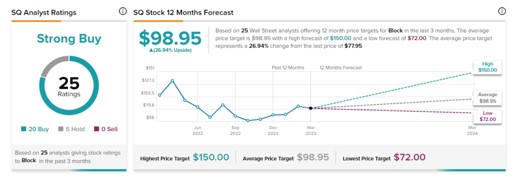 Overall, Block commands a Strong Buy consensus rating based on 20 Buys and five Holds. The average SQ stockprice target of $99.95 suggests about 27% upside. Shares have climbed 21% so far in 2023.