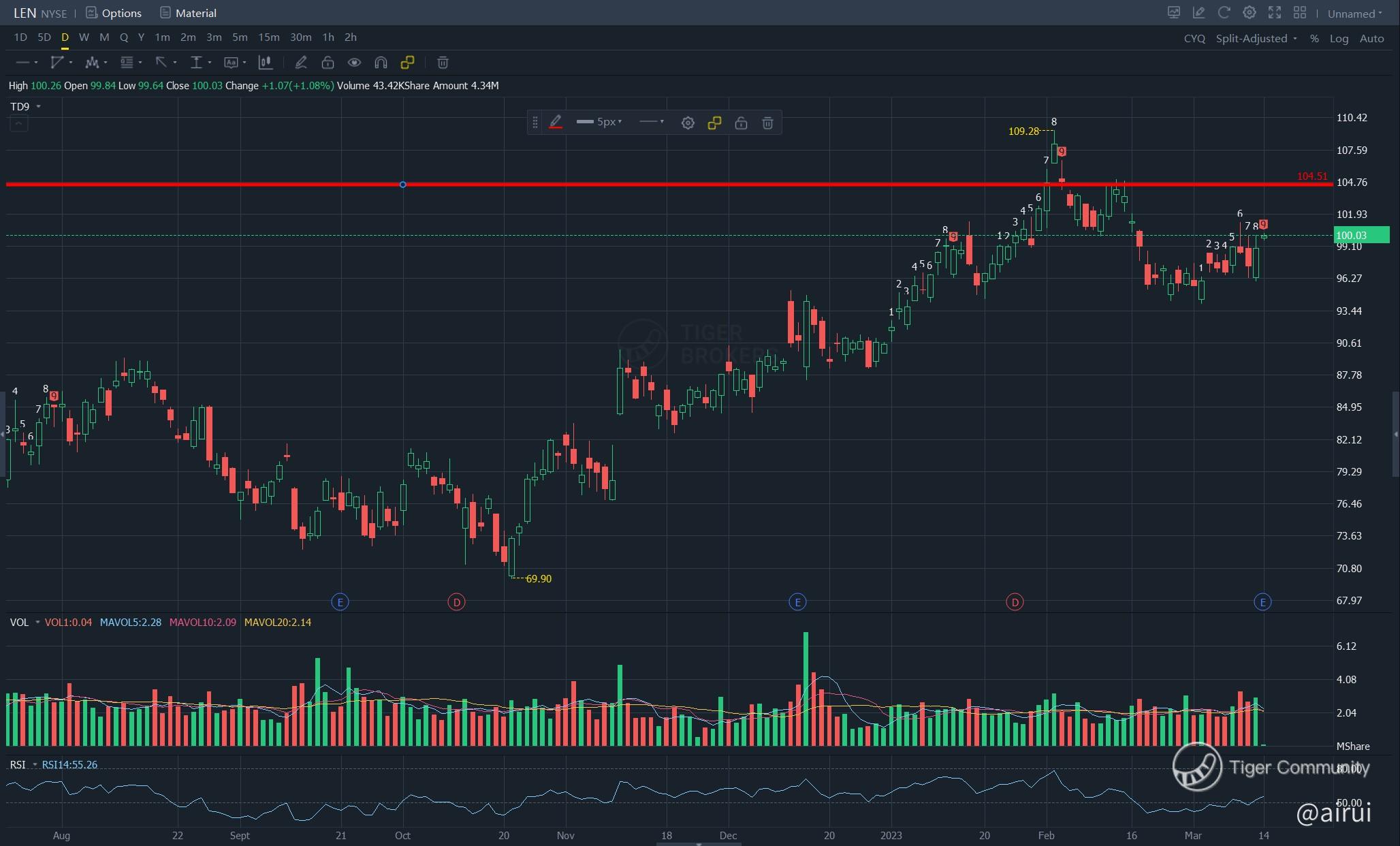 $Lennar(LEN)$ coporation is one of the leading homebuilding companies in the US. With the real estate market experiencing a slowdown, LEN has been in the spotlight due to its upcoming earnings report. Here is a cautious view on how I might trade LEN before earnings.