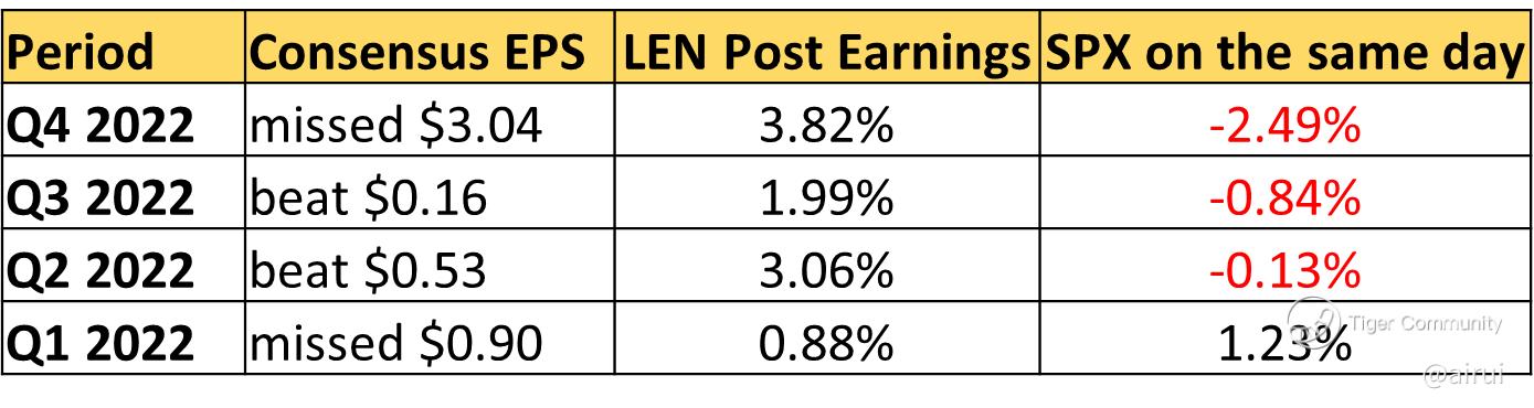It is worth examining the performance of LEN's competitors $D.R. Horton(DHI)$ and $NVR Inc(NVR)$ stock on the day of their earnings report in January. DHI rose 1.38% on the day of earnings while SPX closed flat at -0.07%. NVR rose 4.95% on the day of earnings while SPX rose 1.46%. This indicates that investors may be optimistic about the housing industry as a whole.