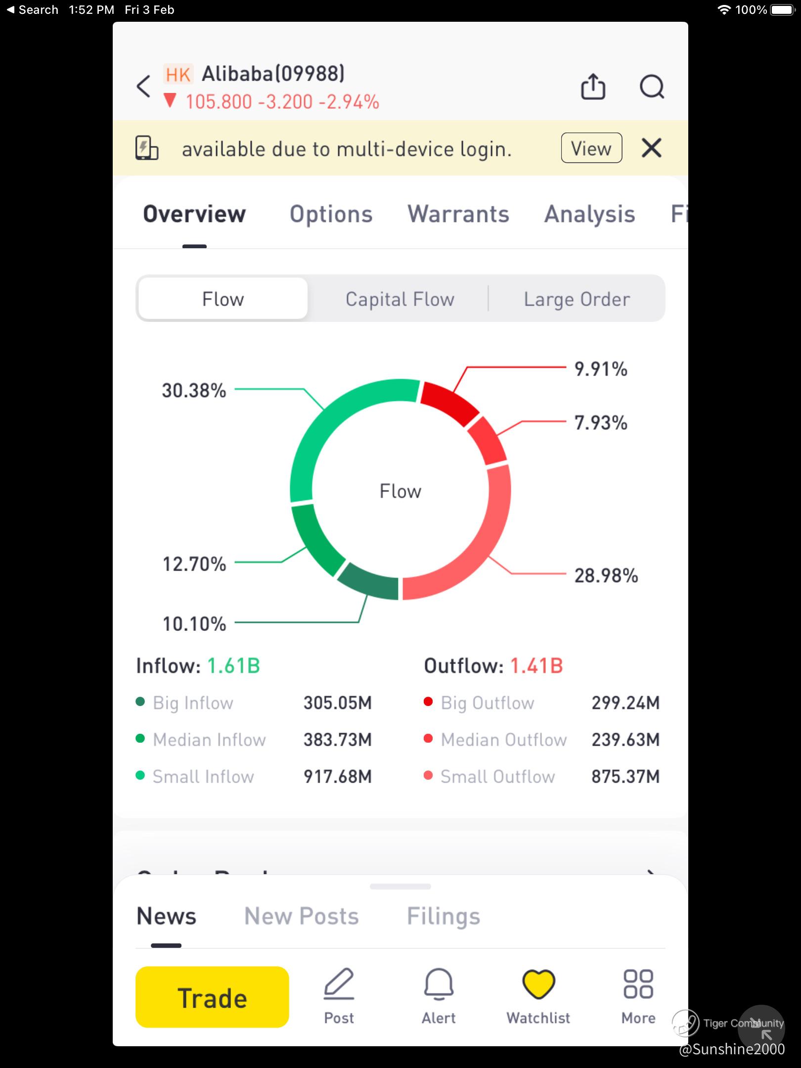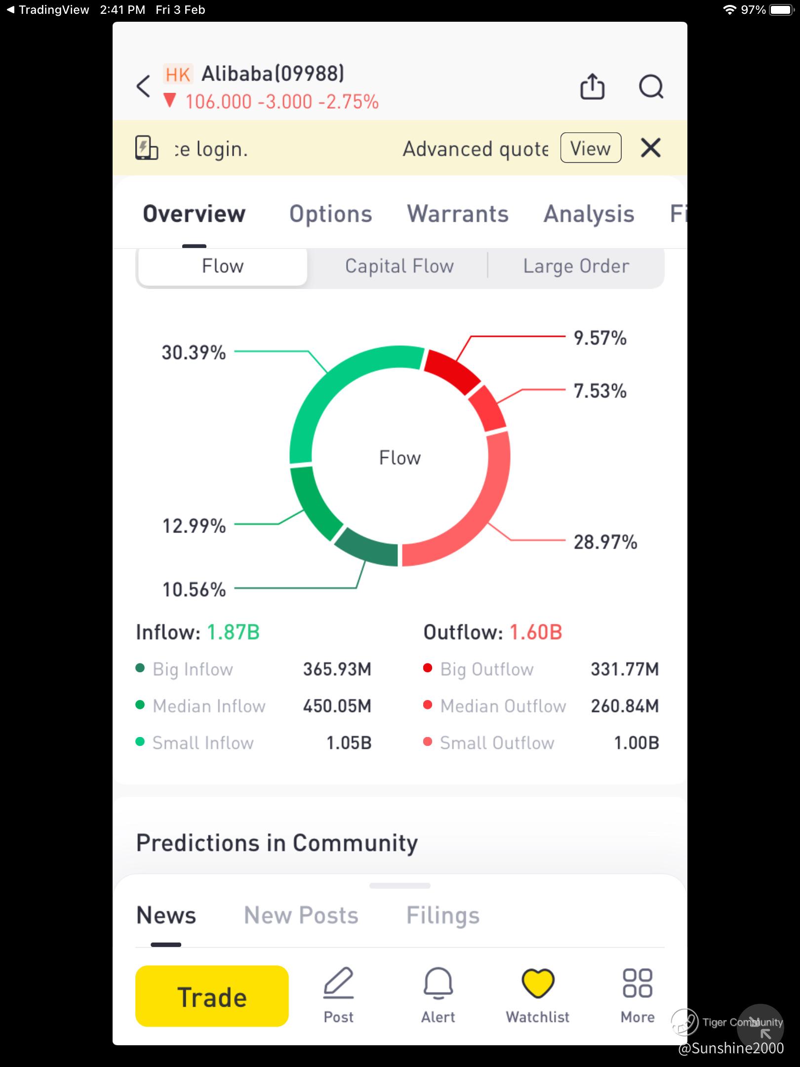 $Alibaba(09988)$ after lunch, the big inflowstarts to move, it is now 365M big inflow vs 330 big outflow. Median and small investors are buying aggressively at lower price range. The overall flow is 279.2M net inflow. Looks like consolidation before a bounce ... don't panic. China is opening up, removing anyquarantine requirement between Hing Kong and mainland ...business should picking up at a faster rate. Do you DD before investing ...