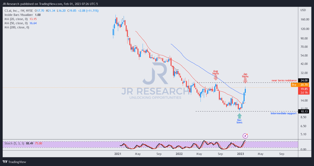 AI has recovered significantly from its December lows, up more than 110% through this week's highs. The vertical rocket-esque surge also sent AI close to its August highs as investors lifted AI-first stocks.