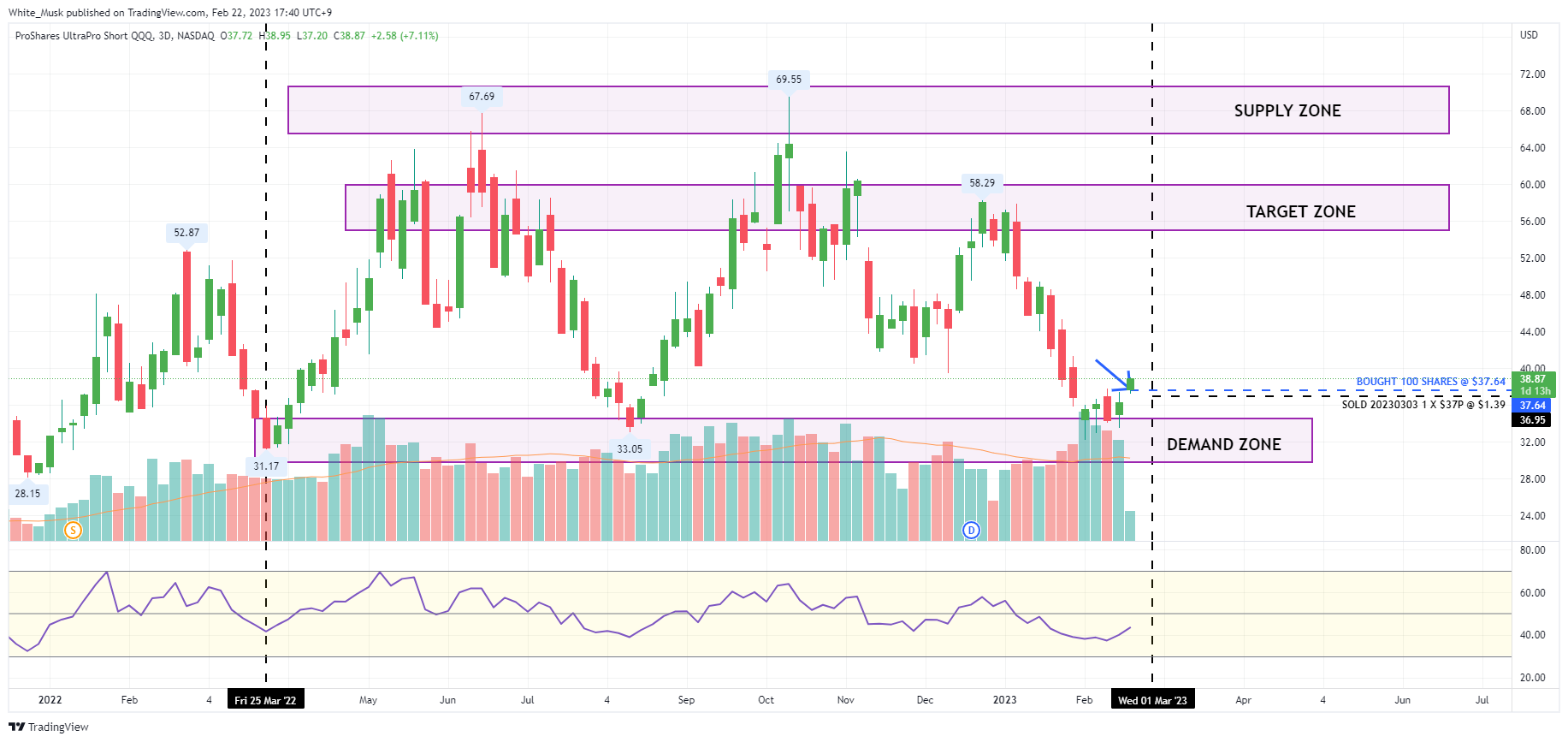 Price reaching demand zone. Went long @ $37.64 + sold a 20230303 $37P at $1.39. Good upside potential to $50s. Target to sell covered calls when market moves higher later on.