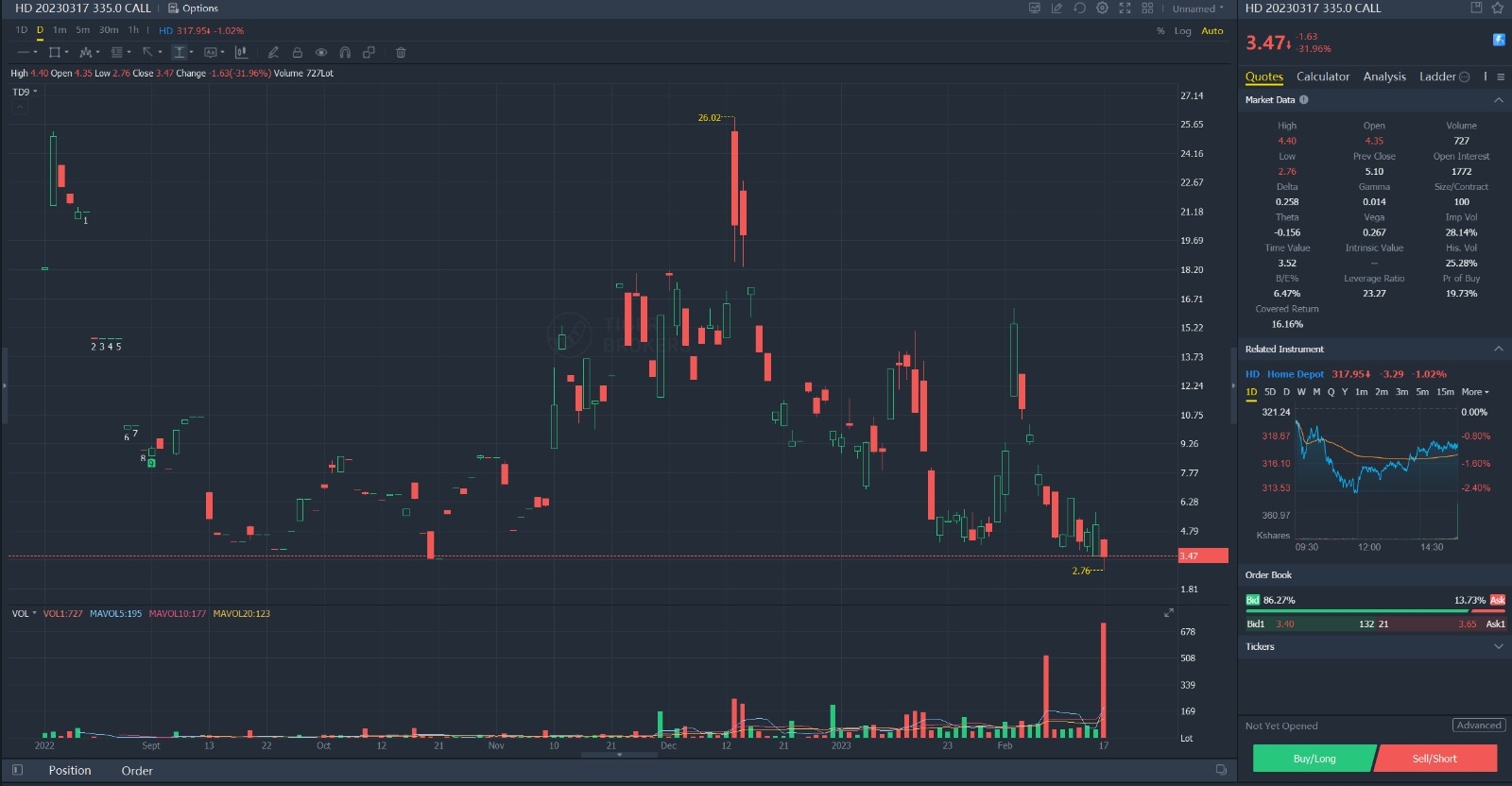 My prefer trade would be selling call option at 335 $HD 20230317 335.0 CALL$ $HD 20230317 335.0 CALL$ expiring on 17 March before the PMI announcements come in.