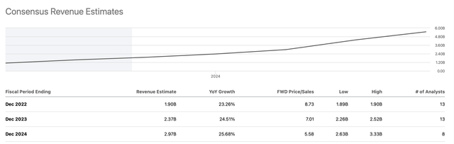 Consensus estimates imply that Palantir's revenues are set to rise to approximately $2.4 billion next year and roughly $3 billion in 2024. However, revenue estimates may be lowballed here, and I expect Palantir to deliver closer to $2.5 billion in revenues next year and roughly $3.3 billion in 2024. Due to Palantir's remarkably long growth runway, the company can probably deliver 25-30% YoY revenue growth through 2030. Given that Palantir's market cap is only around $16 billion, it's trading at fewer than five times 2024 sales estimates, which is remarkably cheap for a hyper-growth company.