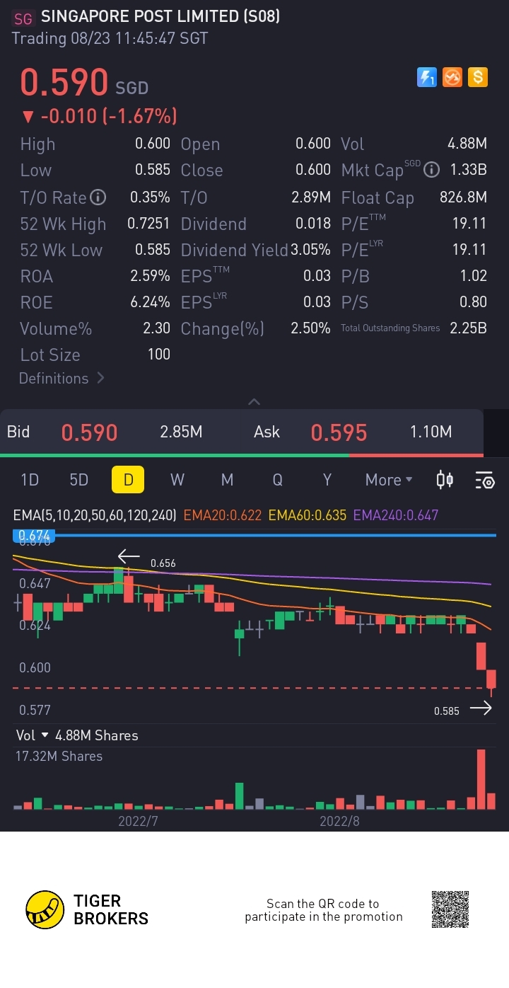 $SINGAPORE POST LIMITED(S08.SI)$bearish price dip sharply
