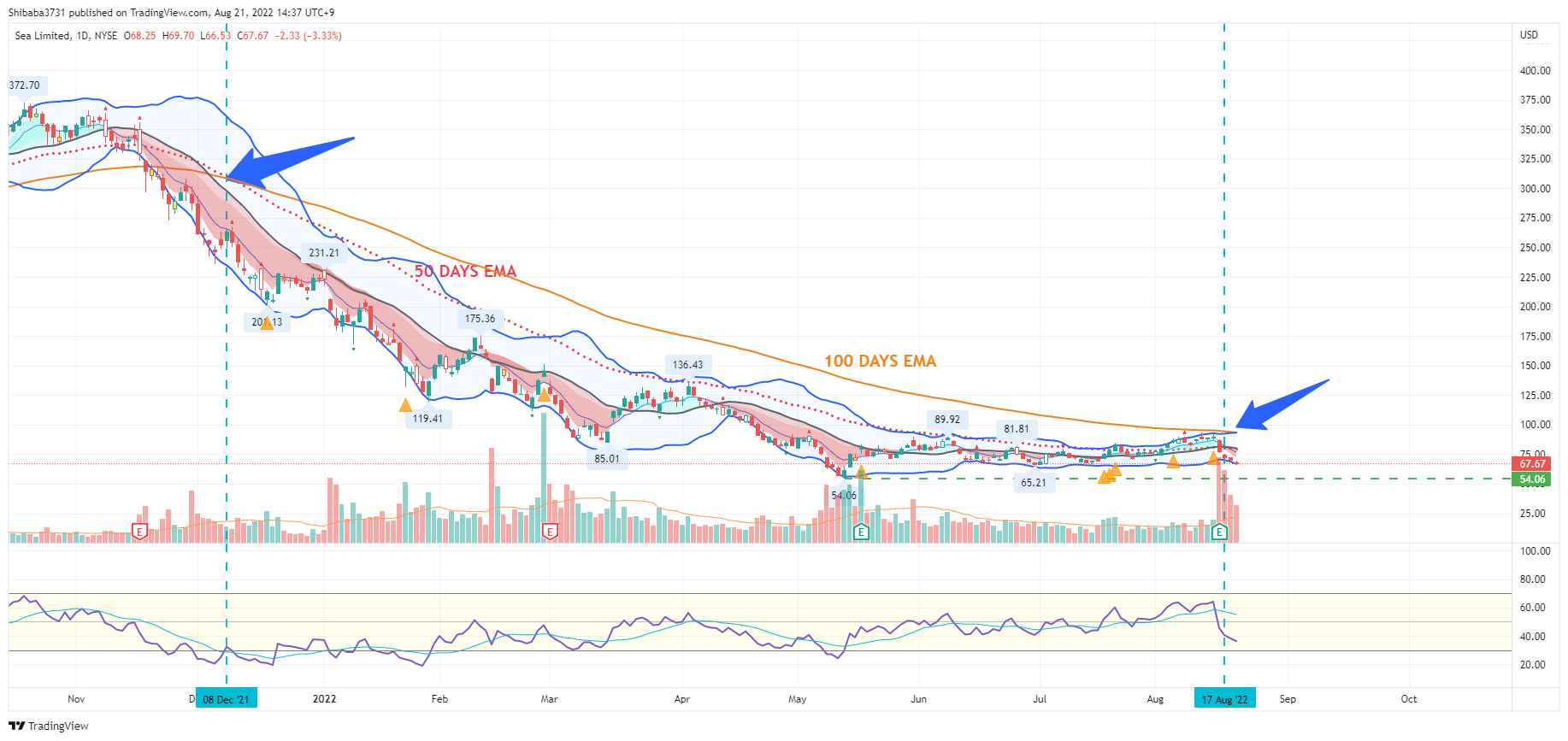 I am not a fundamental analyst, I don't even know if $SE is making money or not. But from a very simple technical analysis, it is not time to buy $SE yet. Simply because 50/100 days EMA has not crossed over & it is technically in a bear trend since Dec 2021.