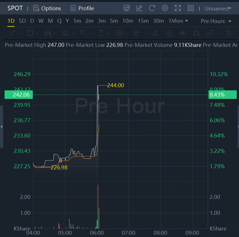 Spotify shares jumped over 8% after reporting fourth-quarter monthly active users and subscribers ahead of expectations as it grew in all regions, and said revenue and profitability trends looked favourable this year.